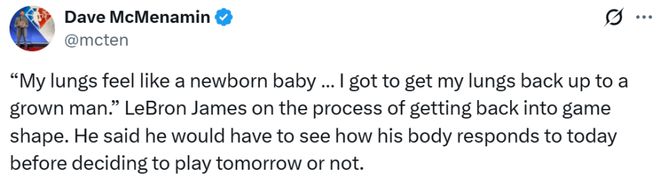 賽季至今,湖人10勝4負,暫時排名西部第四。即將41歲的詹姆斯,因坐骨神經(jīng)痛缺席了這14場比賽。根據(jù)此前的報道,他有望在明日對爵士的比賽中復(fù)出。