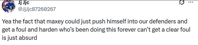 “馬克西只要頂撞我們的防守隊員就能造犯規,而哈登一直以來都是這么做的,卻總是造不出明顯的犯規,這簡直太荒謬了。”