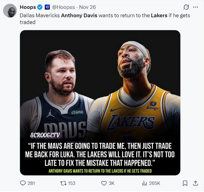 11月26日時,美媒Hoops報道,如果安東尼-戴維斯被交易,那么他愿意重返洛杉磯湖人隊。不過濃眉的原話帶有調侃的性質,他說的是用他換回盧卡糾正雙方交易的錯誤。