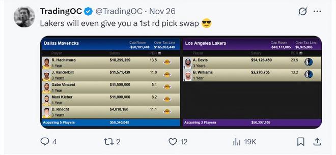 湖媒模擬了一套方案,湖人用:八村壘、范德比爾特、文森特、克勒貝爾、克內克特、1個未來首輪互換權從獨行俠換回濃眉、布蘭登-威廉姆斯。