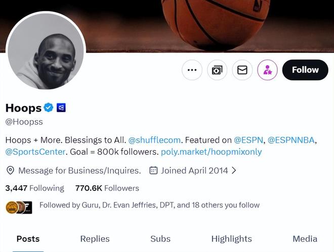 Hoops不是什么假賬號,他有著77萬多的粉絲,而且他除了報道NBA之外還報道NFL、MLB等大型賽事,所以他這條推文此前也引發了巨大的議論。