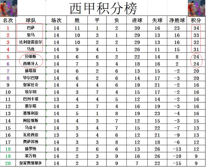 積分榜方面,皇馬連著3場都無力贏弱旅丟分,不少球迷調(diào)侃,皇馬對巴薩是真愛啊,愣是從領(lǐng)先5分到落后1分“讓出”榜首。比利亞雷亞爾今天又贏球,這樣的話他們再超過馬競1分重回前3,西甲前4競爭很激烈,巴薩,皇馬,比利亞雷亞爾,馬競依次1分之差。第5的爭奪同樣激烈,貝蒂斯和西班牙人齊齊贏球,兩隊還是積分一樣,貝蒂斯凈勝球優(yōu)勢位列第5。