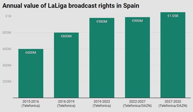 更讓特瓦斯們欣喜的消息來自場外。近日,西甲聯(lián)盟官宣完成2027-28至2031-32周期的西甲國內(nèi)版權(quán)招標(biāo),西班牙電信(Telefónica)與 DAZN 兩家平臺(tái)完成續(xù)約,總價(jià)高達(dá)52.5億歐元,對比上一周期(2022-23至2026-27周期)的49.5億歐元上漲6%。如果算上西乙和商業(yè)場所、免費(fèi)及賽事集錦三大板塊,西甲聯(lián)盟國內(nèi)視聽版權(quán)總收入更是達(dá)到61.35億歐元,對比上一周期錄得9%的增長。